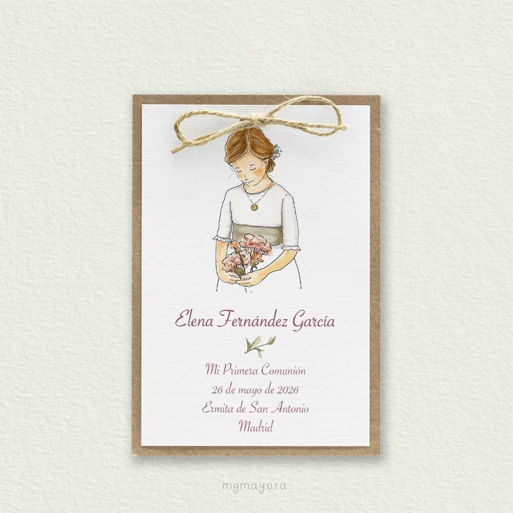 Recordatorio de comunión atado con cordón a una cartulina kraft, con dibujo de niña con un ramo y un rosario en las manos